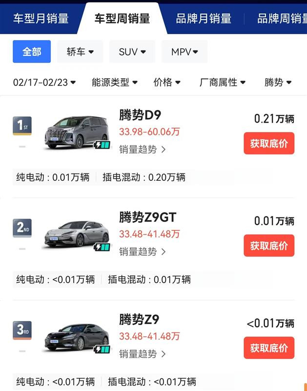 同年12月,腾势Z9开始交付,当月,腾势Z9销量1120辆,而这也只拉动腾势Z9全系销量定格在4685辆,离赵长江的定下的初期5000辆目标还有不少差距。今年1月,腾势Z9 GT开局不利,全系车型累计销量1585辆。2月份,行业周销数据显示,腾势Z9全系单周销量堪堪在百辆左右。